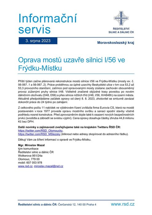 Ve Frýdku-Místku pokračují po otevření obchvatu města nutné opravy komunikací, které byly poškozeny tranzitní dopravou. Ředitelství silnic a dálnic 8. srpna zahájí rekonstrukci dvou mostů v Beskydské ulici v Místku poblíž Tesca. Práce proběhnou za úplné uzavírky Beskydské ulice v určitém rozsahu (v km cca 53,2 až 53,3). Provoz pod opravovanými mosty zůstane zachován obousměrně a zúženými pruhy.