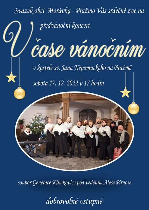 Svazek obcí Morávka – Pražmo vás zve na koncert v kostele Sv. Jana Nepomuckého na Pražmě. V sobotu 17.12.2022 v 17.00 hodin