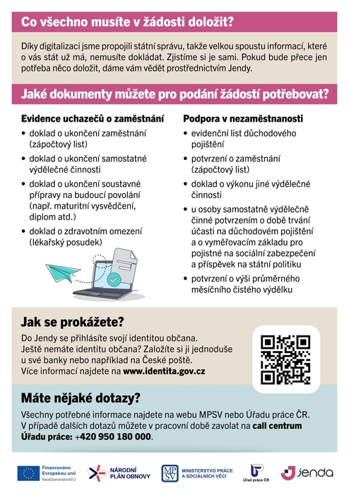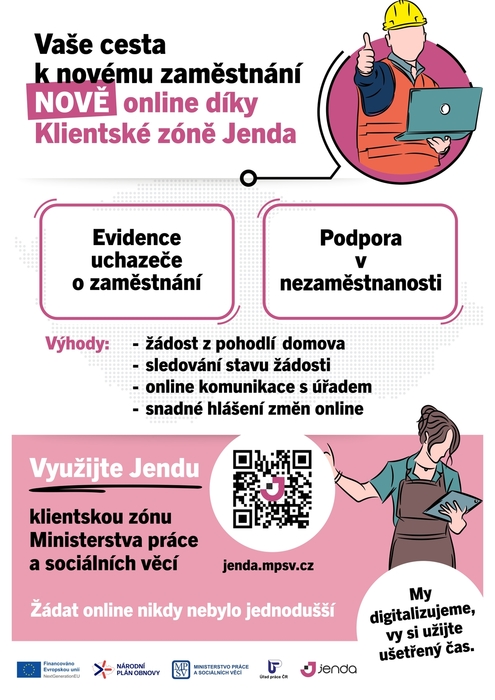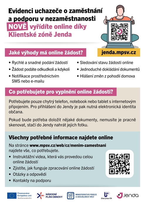 Dovolujeme si Vás informovat, že Úřad práce ČR v rámci digitalizace změnil způsob evidence uchazečů o zaměstnání a od 1.1.2025 mohou občané požádat o zprostředkování zaměstnání prostřednictvím klientské aplikace Jenda, tzn. že nemusí být osobně přítomni na pracovišti Úřadu práce ČR. Zároveň tímto způsobem mohou občané požádat o podporu v nezaměstnanosti. Pokud občané nemají možnost digitálního přihlášení, pak při osobním jednání budou pracovníky úřadu práce zaevidováni a tyto digitální úkony zajistí prostřednictvím asistovaného podání pracovníci úřadu práce. Nyní již občané nepodávají „papírové“ žádosti, ale vše probíhá elektronicky.